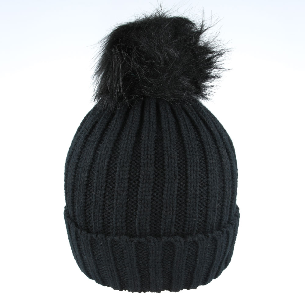 Maz Pom Pom Ribbed Knitted Beanie With Faux Fur – Black
