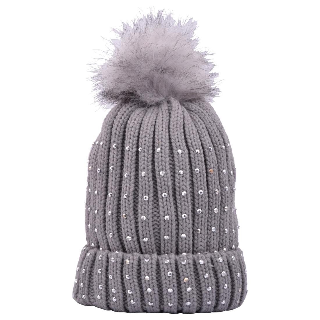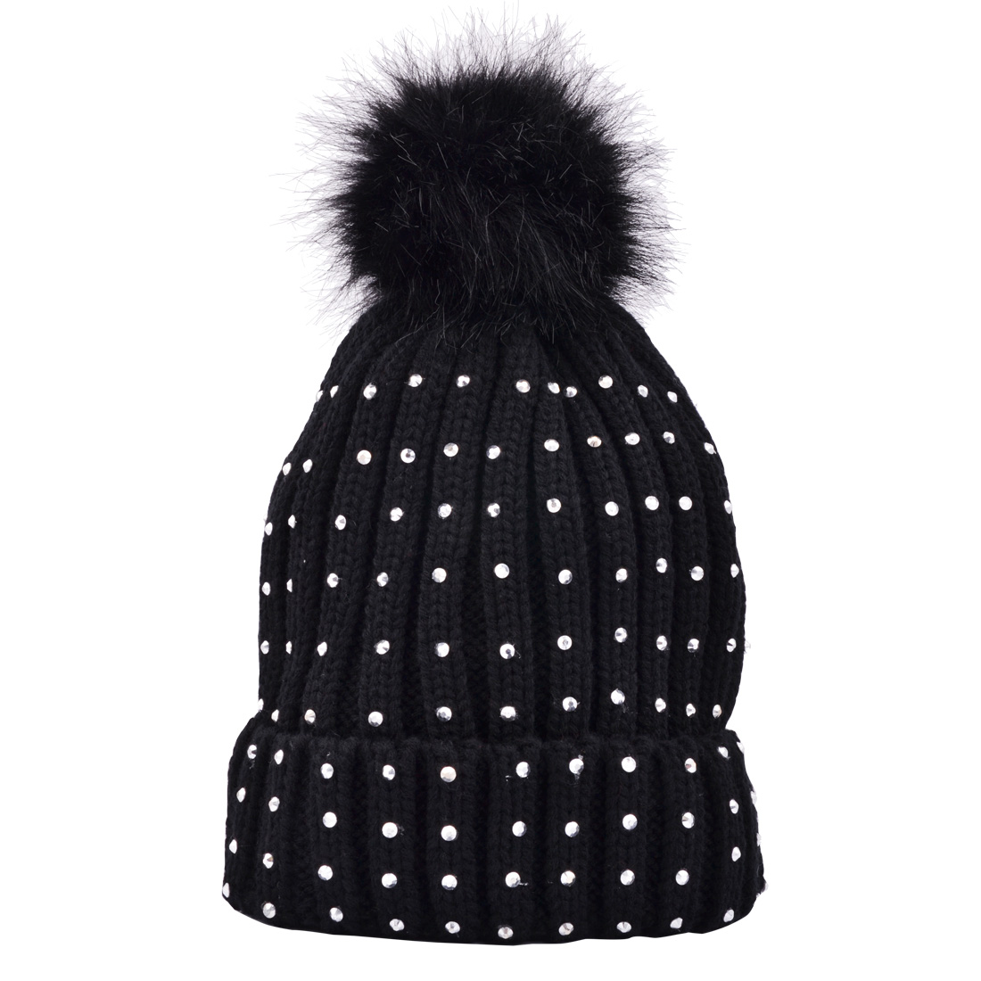 Maz Pom Pom Ribbed Diamante Beanie With Faux Fur Assorted Colours