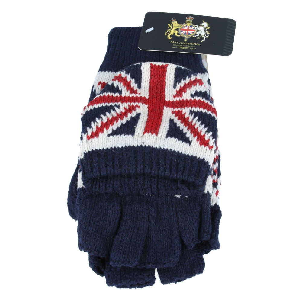 Maz Unisex Union Jack Fingerless Gloves Can Be Worn As Mittens – Blue